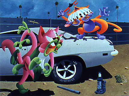 Simmering underground for the last 30 years this, this art has managed to simultaneously remain visible, popular and under the radar of all the art world forces that are often responsible for destroying the very movement they so often create. The artist's work can be found on gallery walls, trendy shops, comic books, posters, movies and on the buildings of our cities. It is Tiki, it is urban, it is fine art, it is graffiti, it is surreal, it is illustrative, it is modern art. With inspirations like Ed "Big Daddy" Roth, R. Crumb, and Robert Williams and contemporaries such as Shepard Fairey, Ron English, Shag, and Camille Rose Garcia whatever you want to call it New Brow, Low Brow, or Pop Surrealism its here and its not going anywhere.