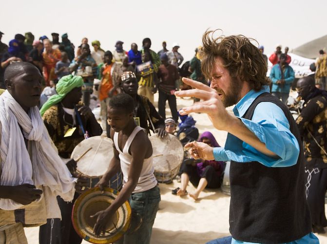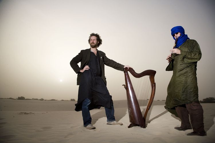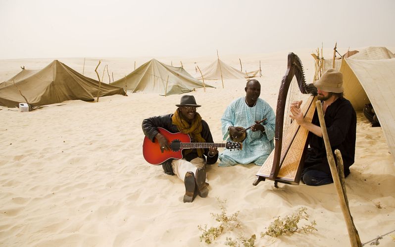 Liam and Paddy play with esteemed Malian musicians such as Afel Bocoum (�Mali Music� with Damon Albarn), Toumani Diabat� (Grammy award winning and master Kora player), Tinariwen (supporting The Rolling Stones �07) and Tartit, and nomadic herders. They all travel to Essakane, 90km outside of Timbuktu, where they give a unique and stunning performance to an audience of thousands at the world�s most remote music festival, the �Festival au Desert�.