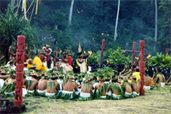 The elder tells us the legend of Con Tiki Viracocha and the ‘Children of the Sun’ arriving from Peru. A re-enactment of Viracocha’s fleet of hundreds of balsa rafts leaves one in awe of the size of the expedition. Con Tiki Viracocha was a direct descendant of the ancestral figure Vira-cocha (Thunder Lake), a man of wisdom and peaceful ways. His descendants, the Uros, live on floating reed beds in Lake Titicaca. Their culture and reed-making techniques are similar to people who live in the swamps on the Tigris and Indus Rivers people who worship the wise and peaceful ancestral figure Vajrapani (Thunder water). Could a migration from the Persian Gulf to Peru and into the Pacific have influenced this Pacific culture?