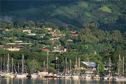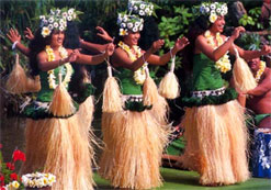 A Tahitian is fishing in a traditional outrigger. He tell us of yesteryear and as the camera focuses on the reflections of mountains in the glassy calm lagoon, a scene from the past unfolds as a flotilla of catamarans in their entire regalia loom into view as they welcome the Aroi dancers sailing in from the island of Raiatea.